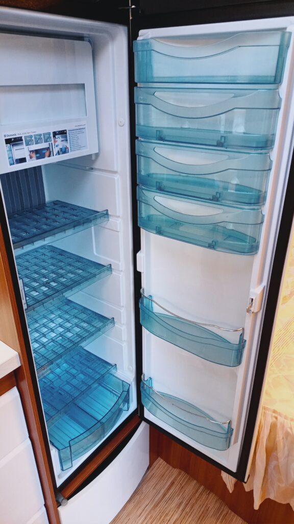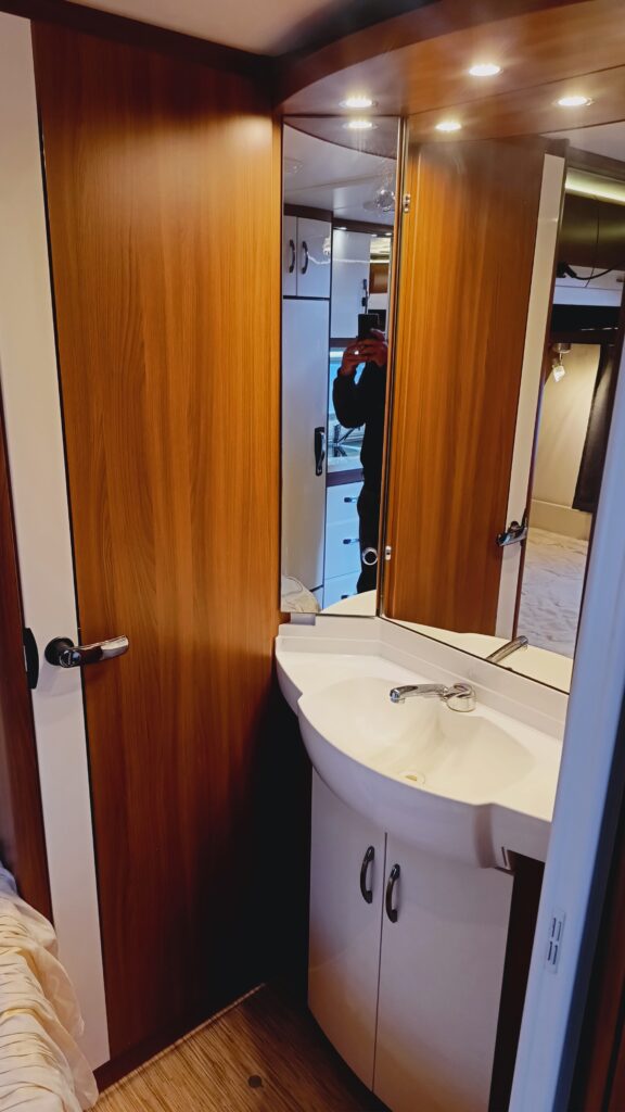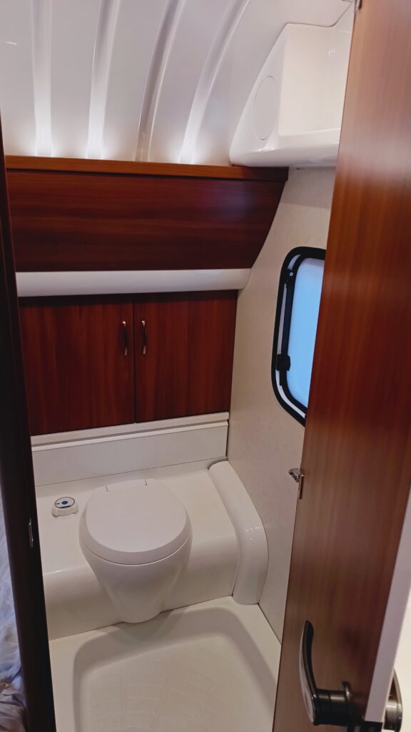 W przyczepie jest łazienka z umywalką, brodzikiem i WC kasetowym, opróżnianym z zewnątrz przyczepy,