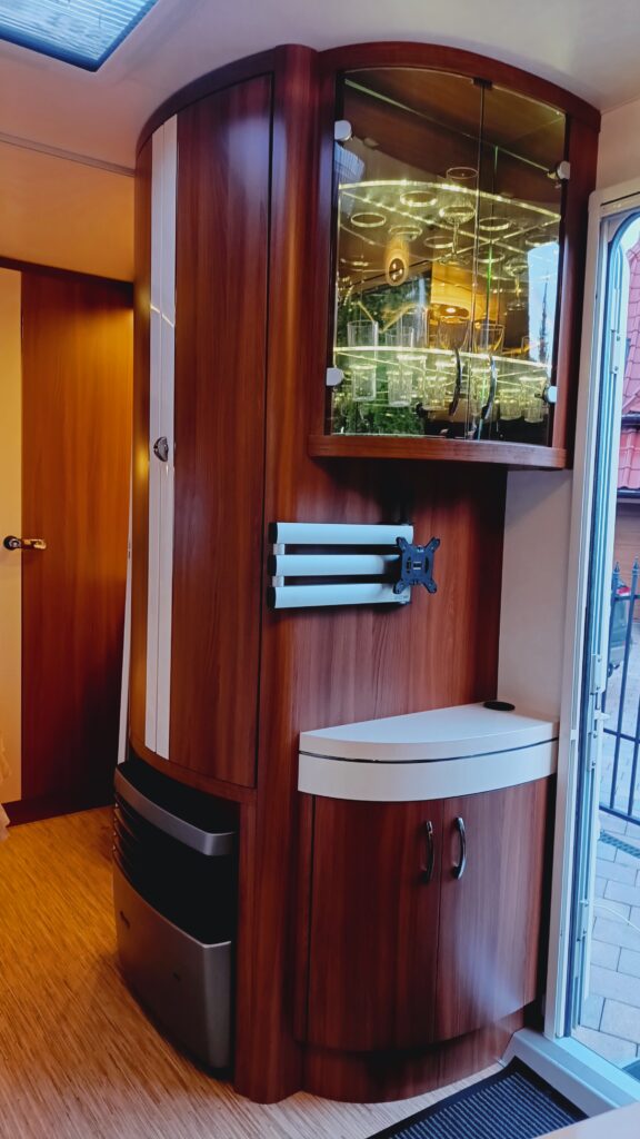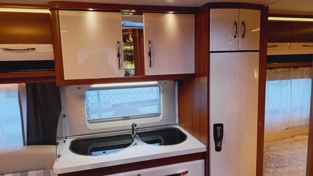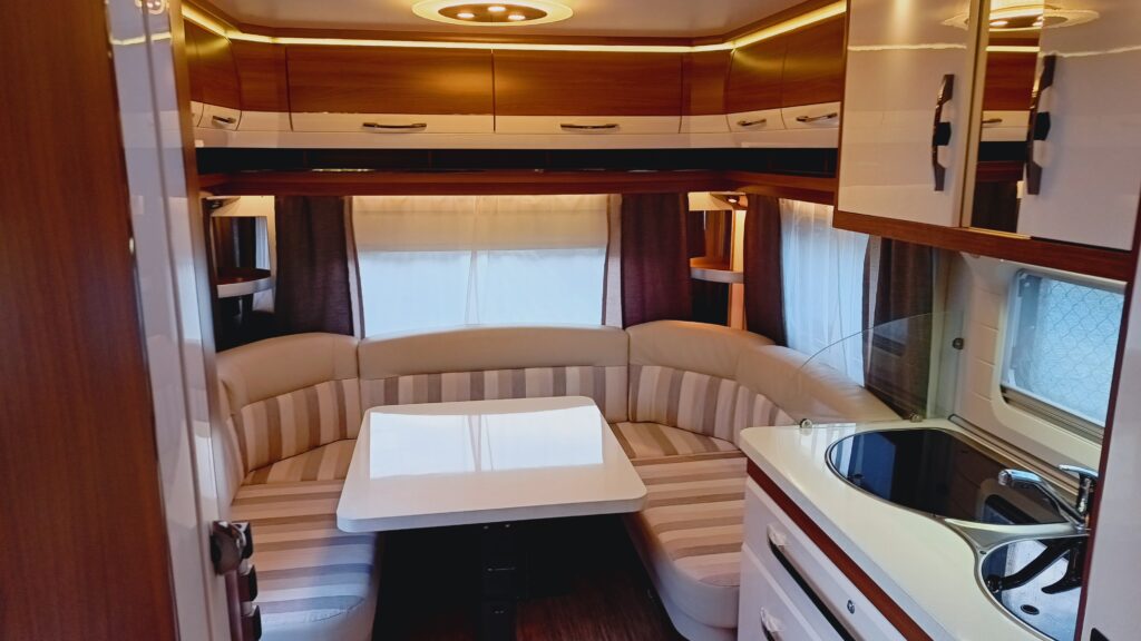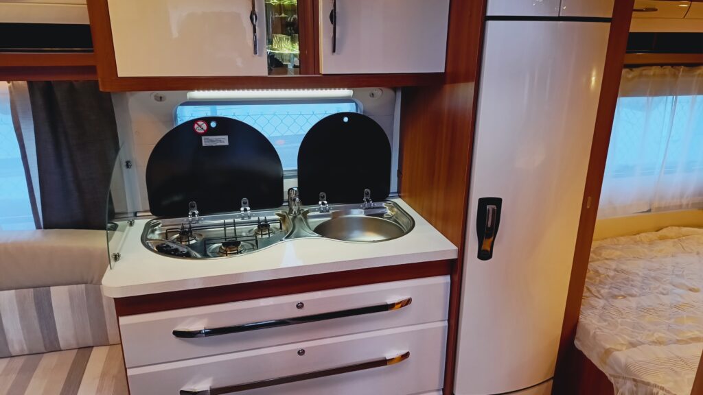 na wyposażeniu lodówka, zlewozmywak, kuchenka gazowa, ogrzewanie gazowe, ogrzewanie podłogowe, zbiornik z pompą wody napełniany z zewnątrz przyczepy, podgrzewacz wody THRUMA, KLIMATYZACJA DACHOWA, okna całe, w oknach rolety i moskitiery, moskitiera drzwiowa, okno dachowe panoramiczne, panel sterujący dotykowy, dużo oświetlenia LED, szuflady samo domykające, duża lodówka, bagażnik rowerowy THULA, którego nie ma na zdjęciach, instalacja 12/230V, instalacja tv z masztem i anteną, uchwyt tv, nowe opony (1000zł), zaczep ze stabilizatorem ( wymienione okładziny), MARKIZA BOCZNA, zbiornik wody szarej, stopień wejściowy, korba do podpór, koło manewrowe, hamulec najazdowy i inne,
