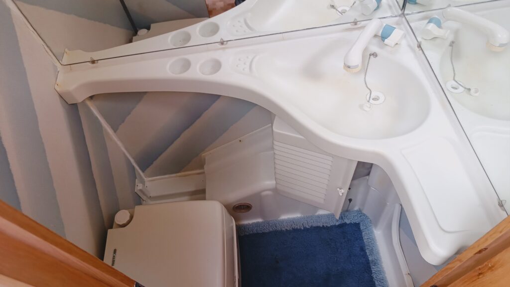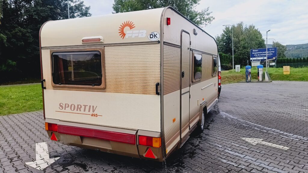 W przyczepie jest łazienka z umywalką, brodzikiem i WC chemicznym,
