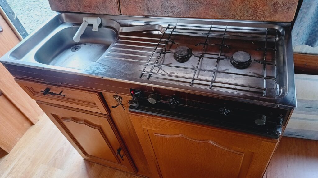 na wyposażeniu lodówka, zlewozmywak, kuchenka gazowa, ogrzewanie gazowe, okna całe, w oknach moskitiery, zbiornik z pompą wody, korba do podpór, hamulec najazdowy, koło manewrowe i inne,