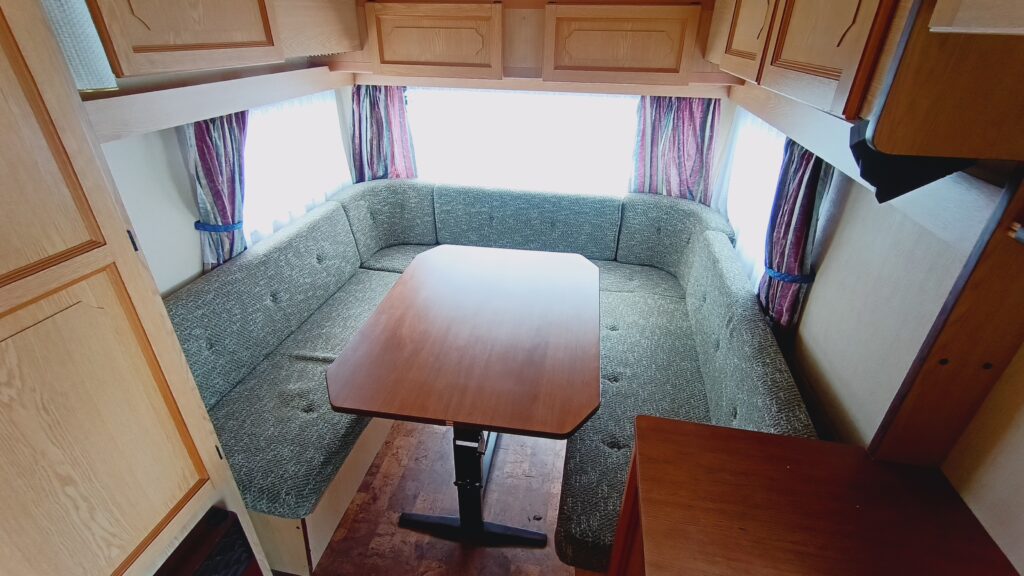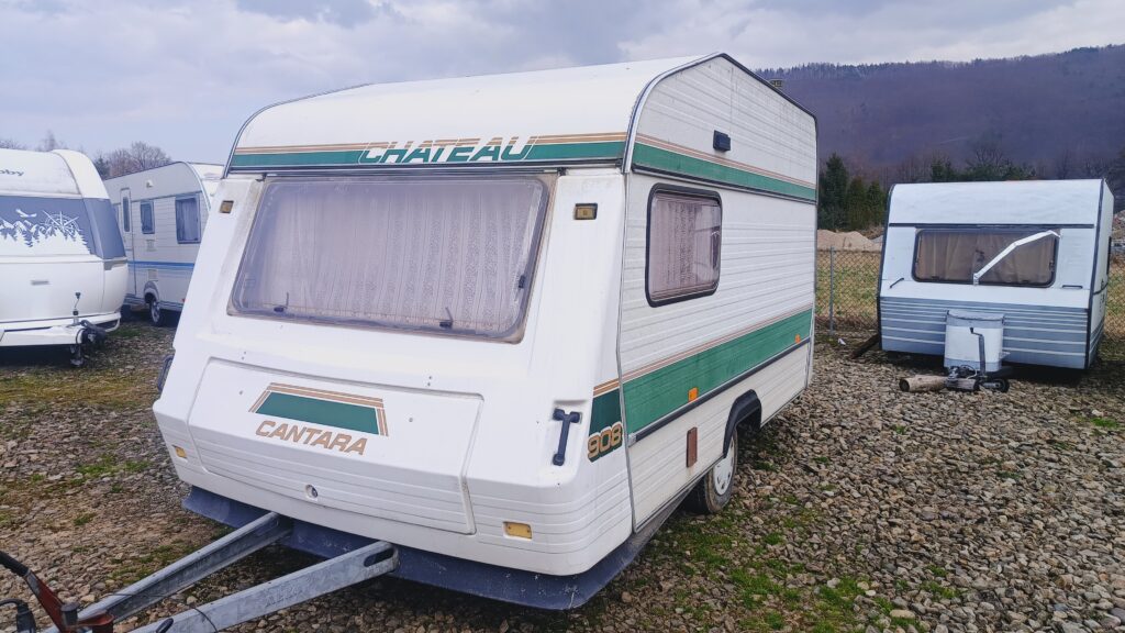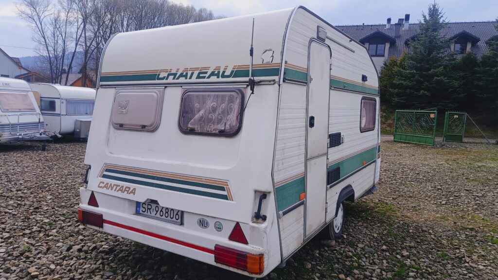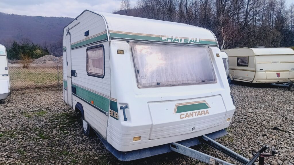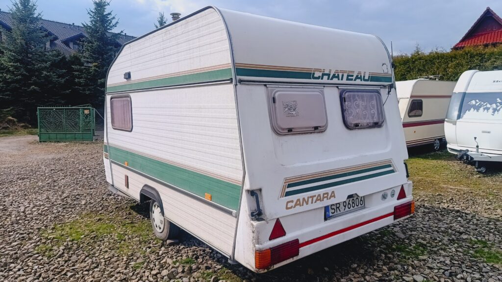 Przyczepa znanej marki CHATEAU, rok 85, fajna i niedroga, 3 osobowa, posiada jedno duże spanie, ławę, szafę, szafki, schowki,
