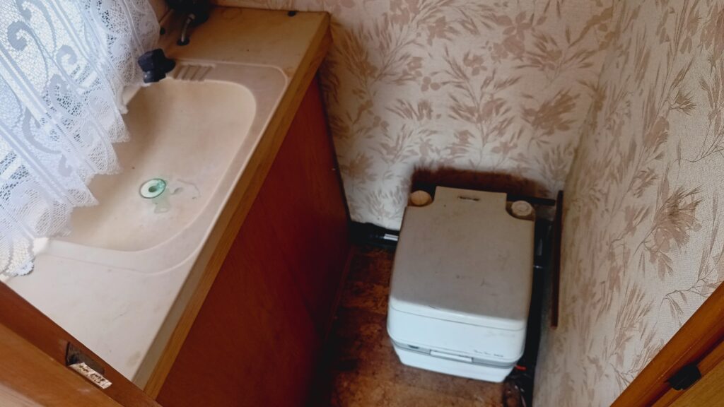 w przyczepie jest łazienka z umywalką i WC chemicznym,