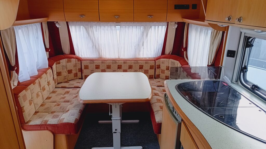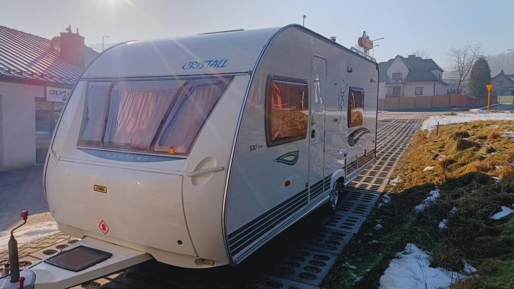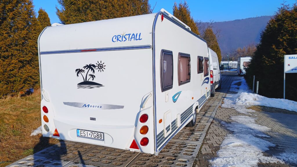 Przyczepa kempingowa znanej marki CRYSTALL, model MOOREA 530, rok 2006, ładna z bardzo funkcjonalnym układem i dobrze doposażona, sprowadzona, zarejestrowana w Polsce, 4/5 osobowa, posiada dwa osobne miejsca do spania, w tym sypialnię zamykaną drzwiami, w której są dwa pełnowymiarowe łóżka oraz salon w tzw. podkowę z możliwością rozłożenia na spanie, ława, szafa, szafki, schowki,