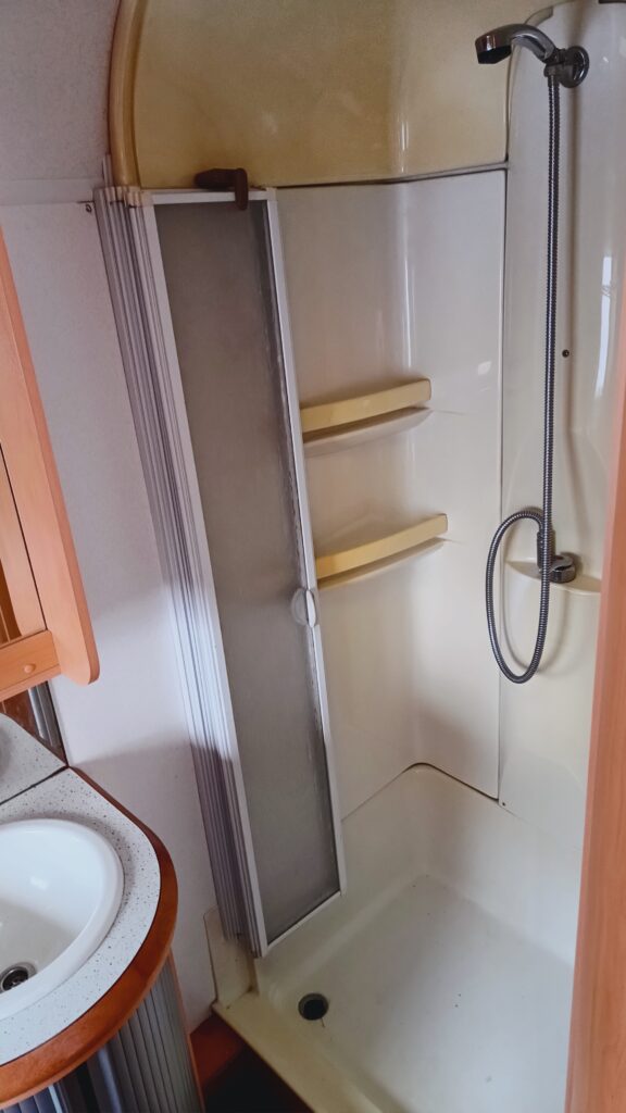 W przyczepie jest duża- podwójna łazienka łazienka z umywalką, brodzikiem i WC kasetowym – opróżnianym z zewnątrz przyczepy, osobno WC i osobno kabina prysznicowa,