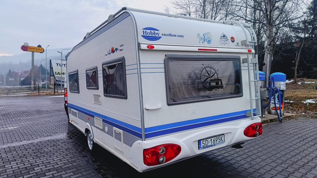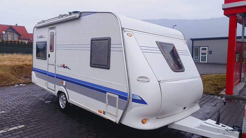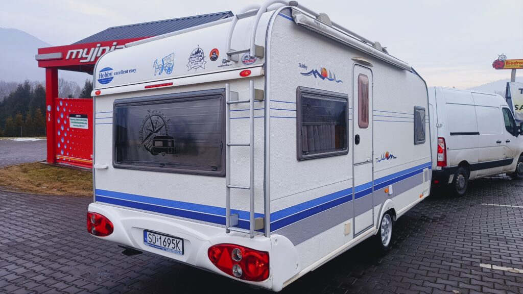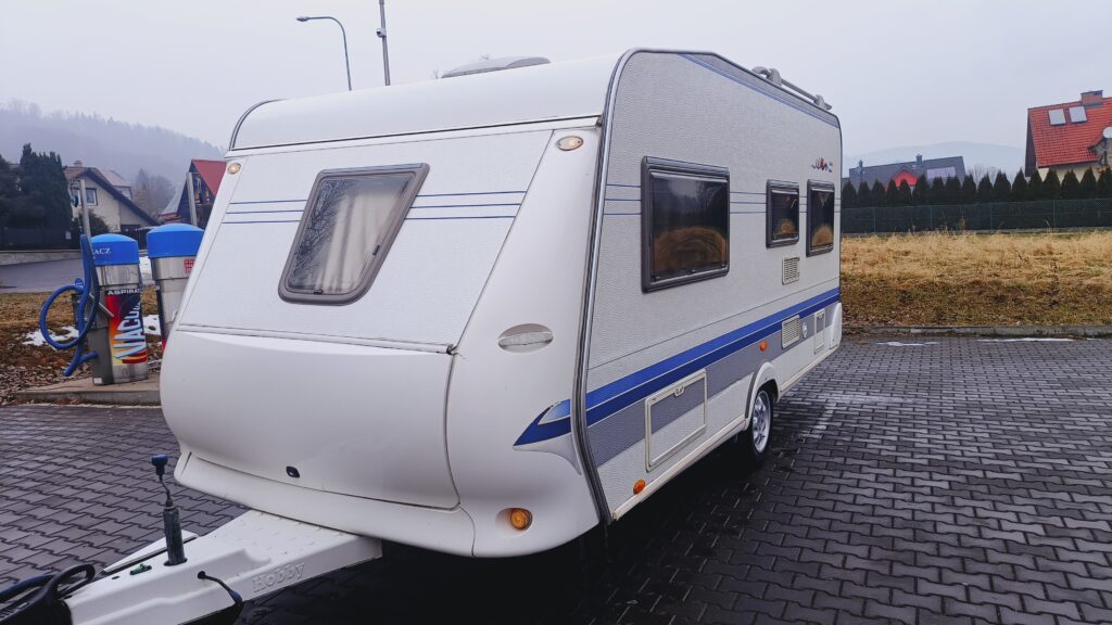 Przyczepa kempingowa HOBBY, rok 2005, zarejestrowana w kraju, fajna przyczepa dobrze wyposażona i w dobrej cenie, 4/5 osobowa, posiada dwa osobne miejsca do spania, w tym sypialnię zamykaną drzwiami drewnianymi, w której jest łoże małżeńskie i toaletka z umywalką i lustrem oraz salon w tzw. podkowę, z możliwością rozłożenia na spanie, ławę, szafę, szafki, schowki,