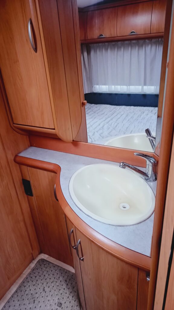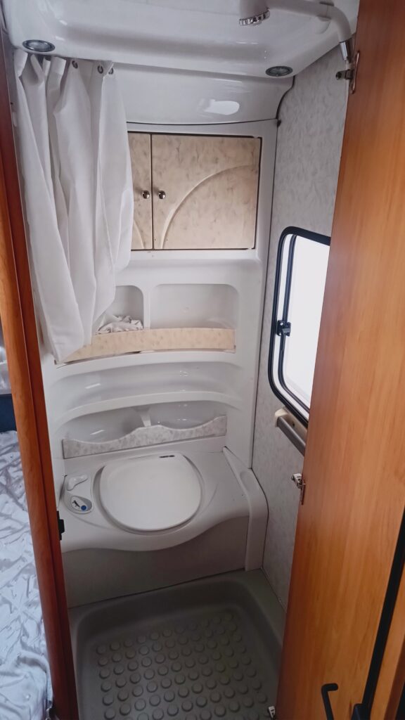 W przyczepie jest łazienka z umywalką, brodzikiem i WC kasetowym – opróżnianym z zewnątrz przyczepy,