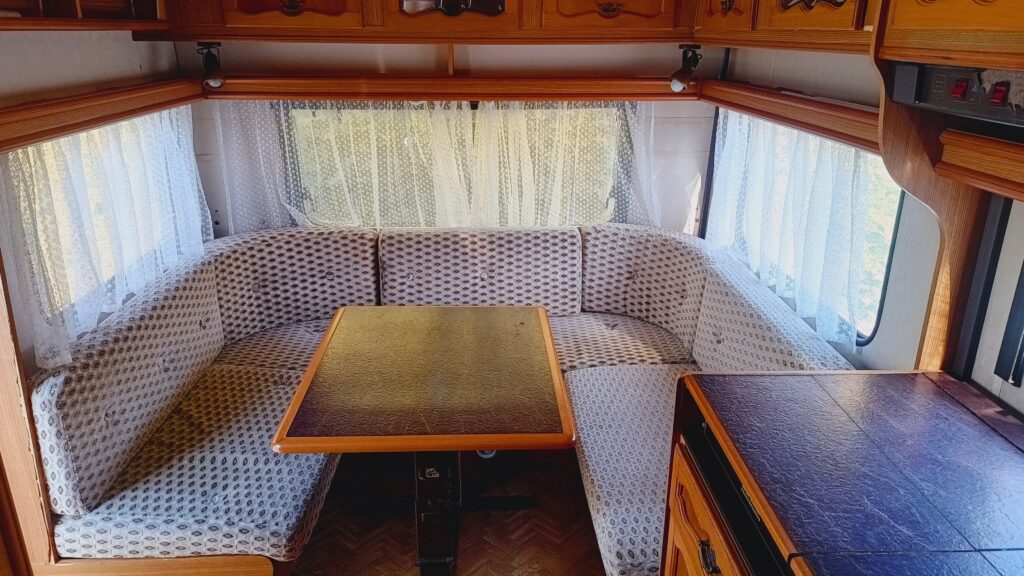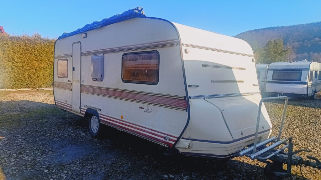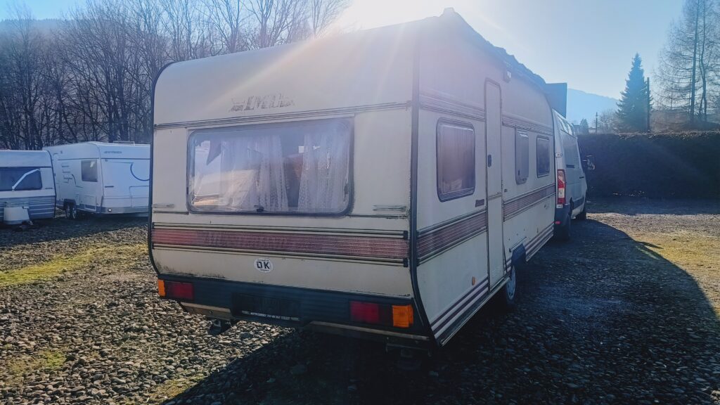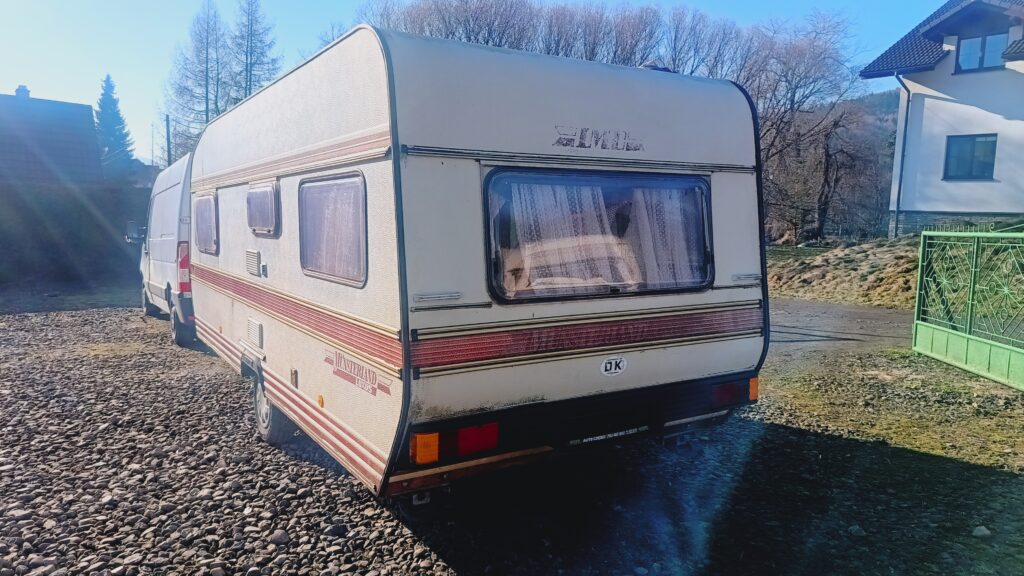 Przyczepa kempingowa niemieckiej marki LMC, rok 87, sprowadzona, w trakcie rejestracji w kraju, fajna i bardzo funkcjonalna, 5/6 osobowa, posiada dwa osobne miejsca do spania, w tym sypialnię w której jest stolik z siedziskami rozkładany na spanie i łóżko z łóżkiem piętrowym oraz po przeciwnej stronie salon w tzw. podkowę z możliwością rozłożenia na spanie, 2 ławy, szafa, szafki, schowki,