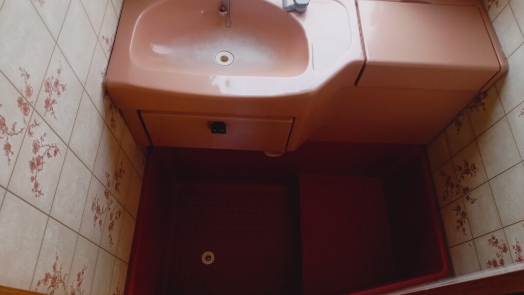 W przyczepie jest łazienka z umywalką i brodzikiem,