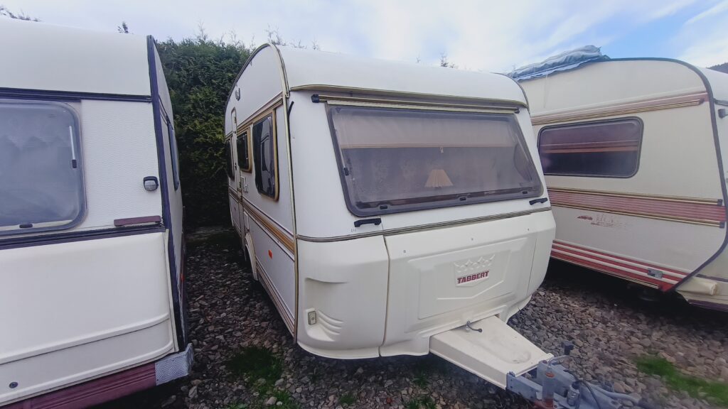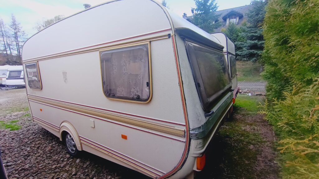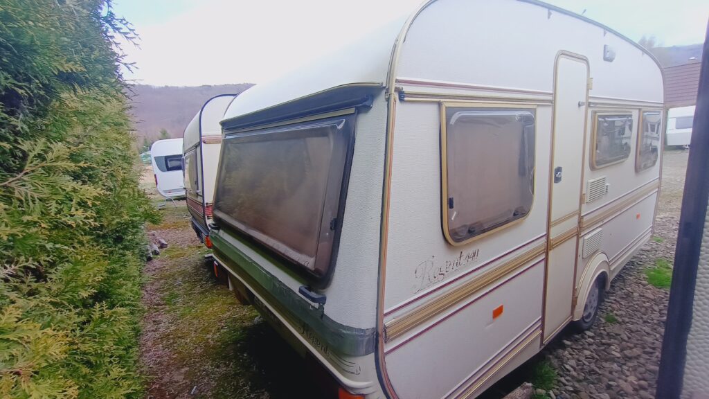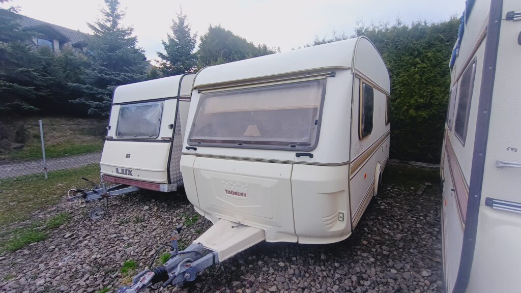 Przyczepa kempingowa niemieckiej marki TABBERT, rok 88, sprowadzona z Danii, w trakcie rejestracji w kraju, fajna i niedroga, 4/5 osobowa, posiada dwa osobne miejsca do spania, w tym sypialnię z łożem małżeńskim, z możliwością odgrodzenia oraz salon w tzw. podkowę, z możliwością rozłożenia na spanie, ława, szafa, szafki, schowki,