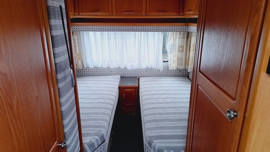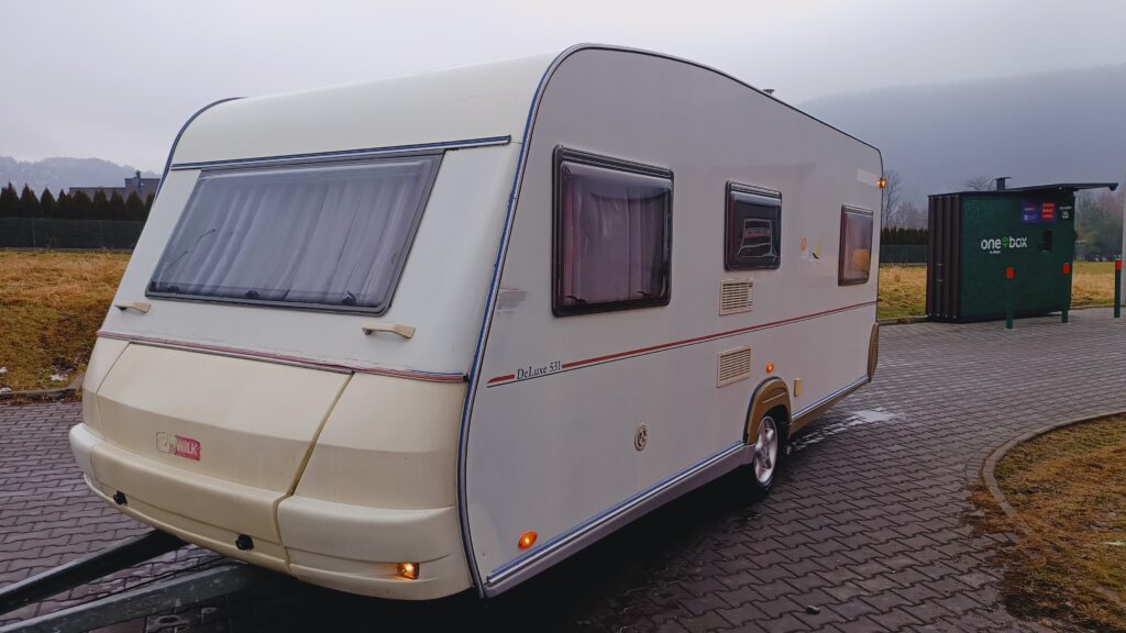 Przyczepa kempingowa niemieckiej marki WILK, rok 2001, sprowadzona z Danii, w trakcie rejestracji w kraju, fajna i funkcjonalna, 4/5 osobowa, posiada dwa osobne miejsca do spania, w tym sypialnię zamykaną drzwiami drewnianymi, w której są dwa pełnowymiarowe łóżka, które można połączyć przesuwając w łoże małżeńskie oraz salon w tzw. podkowę z możliwością rozłożenia na spanie, ławę, szafę, szafki, schowki,
