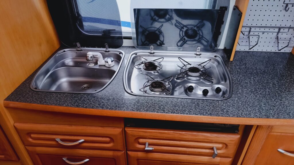 W przyczepie jest łazienka z umywalką, brodzikiem i WC kasetowym, opróżnianym z zewnątrz przyczepy,